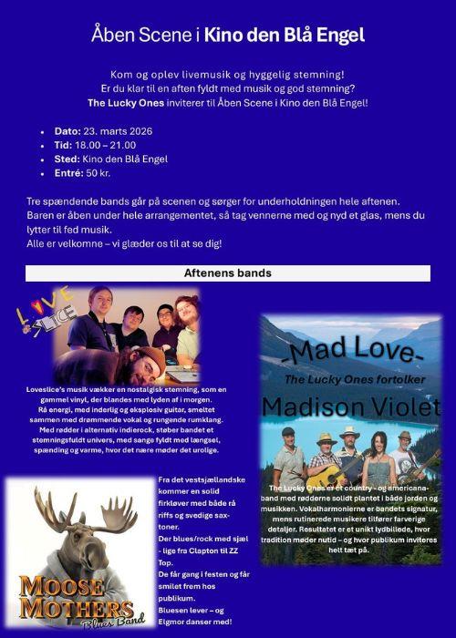 Open Scene i Kino den Blå Engel Kom og oplev livemusik og hyggelig stemning! Er du klar til en aften fyldt med musik og god stemning? The Lucky Ones inviterer til Åben Scene i Kino den Blå Engel! " Dato: 23. marts 2026 " Tid: 18.00 - 21.00 " Sted: Kino den Blå Engel " Entré: 50 kr. Tre spændende bands går på scenen og sørger for underholdningen hele aftenen. Baren er åben under hele arrangementet, så tag vennerne med og nyd et glas, mens du lytter til fed musik. Alle er velkomne - vi glæder os til at se dig!